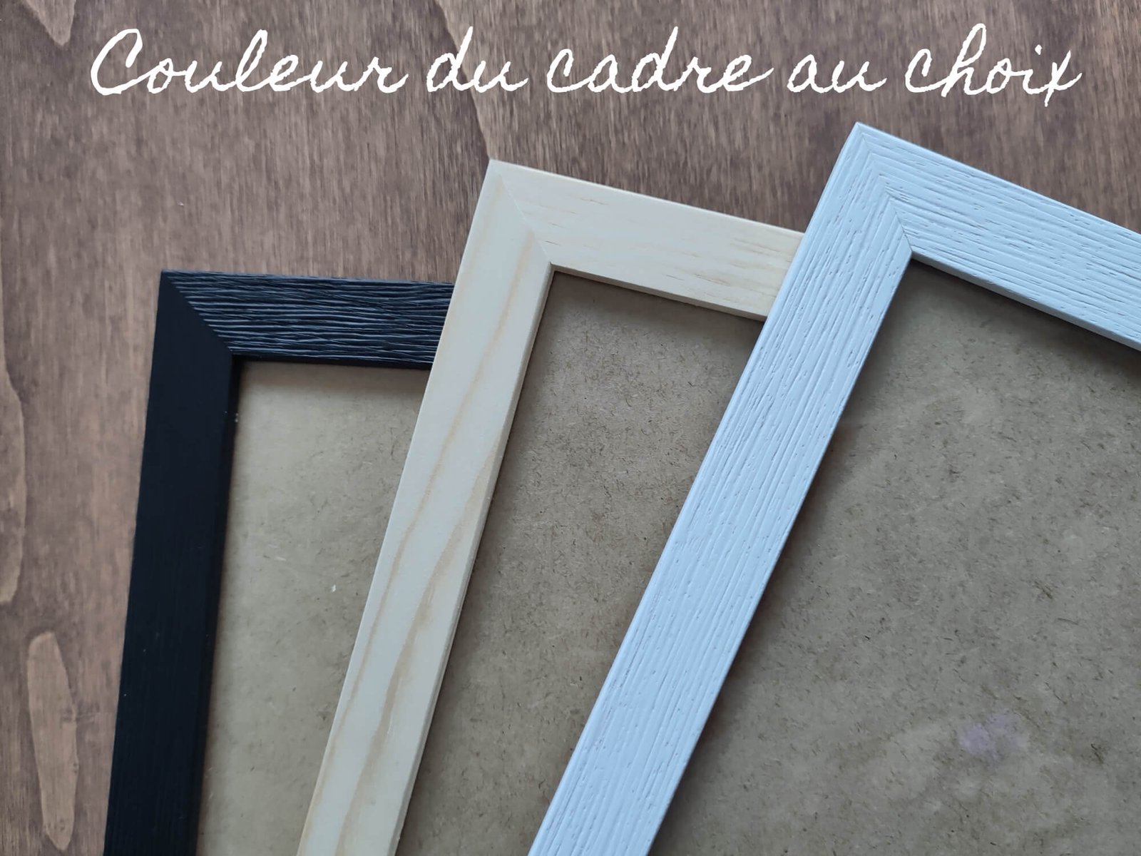Pour le choix de l’option « avec passe-partout et cadre », le passe partout est blanc et le cadre est plat, couleur au choix, format 30 x 40 cm. Les cadres proposés sont en bois et fabriqués en France.