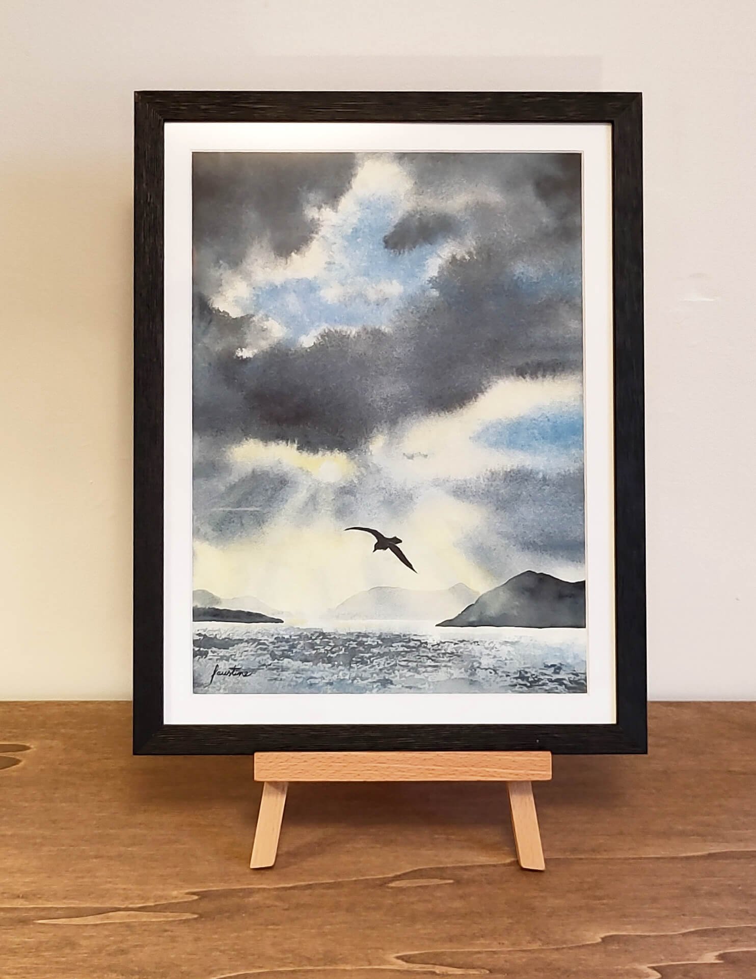 Profitez des lumières et d’un oiseau survolant la mer dans ce ciel d’orage avec cette aquarelle ! Cette œuvre existe aussi en impressions à la demande plusieurs formats, disponibles ici.