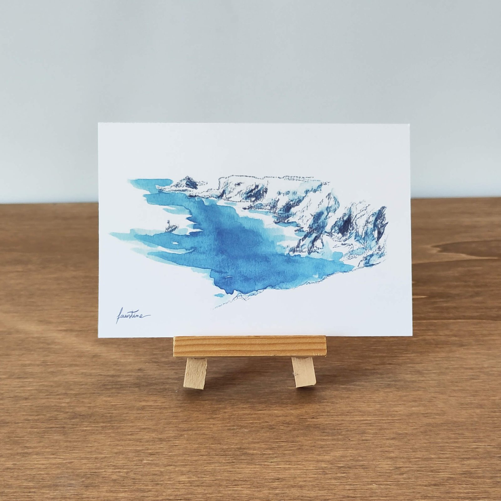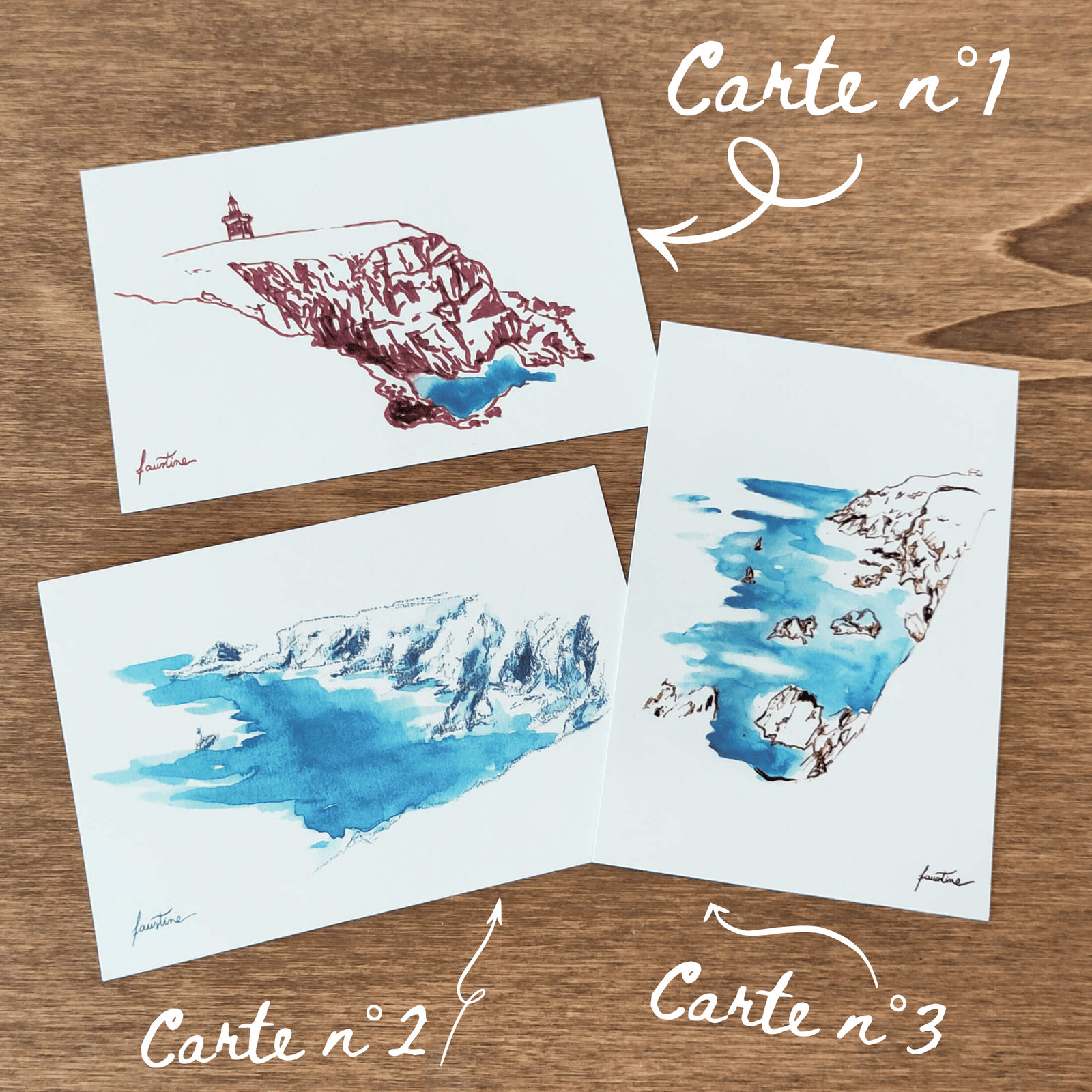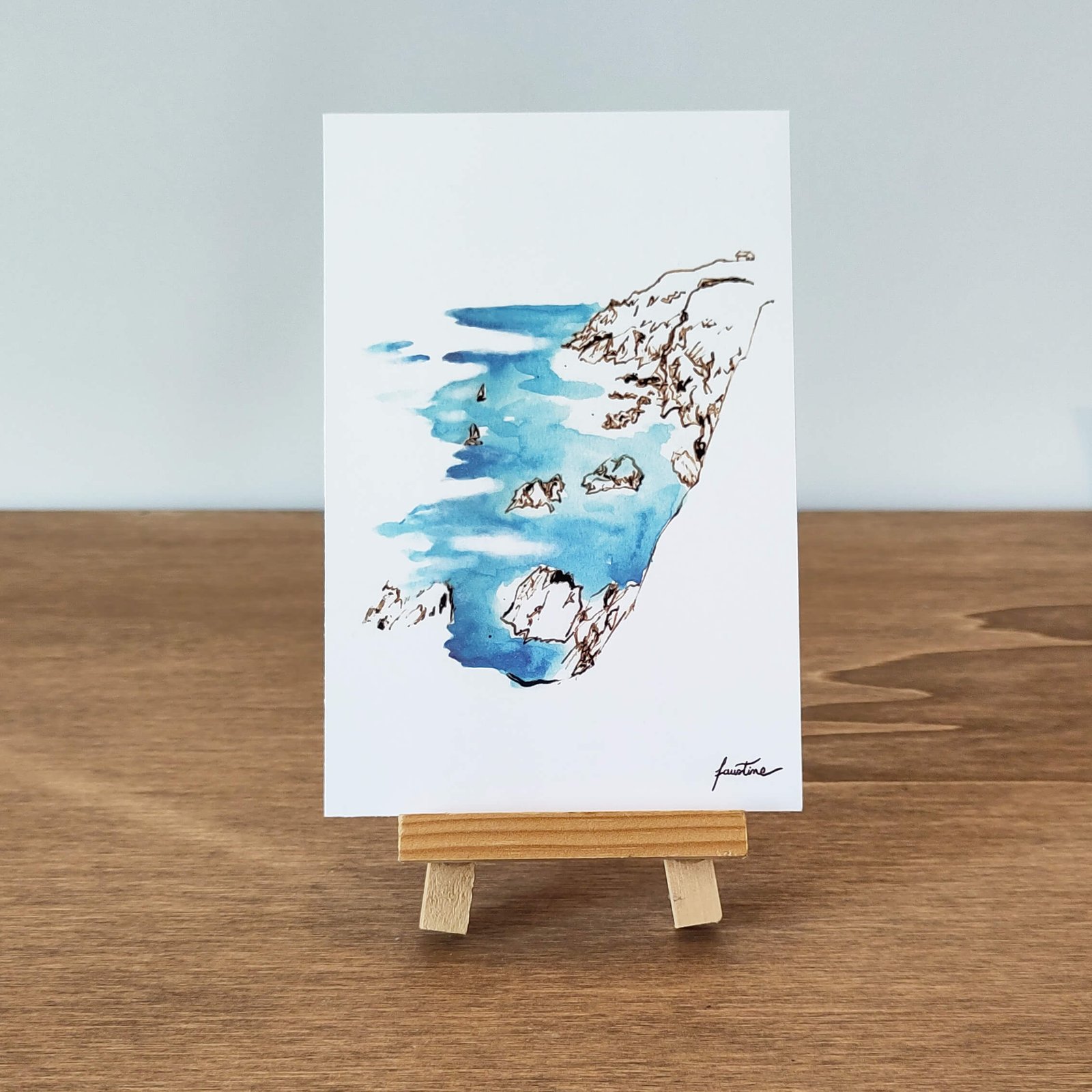 Ces impressions de cartes postales avec une touche d’aquarelle bleue pour la mer sont issues des originaux réalisés in situ à l’île de Groix. Les falaises sont réalisées avec plusieurs techniques (crayon de couleur, feutre, encre et plume).