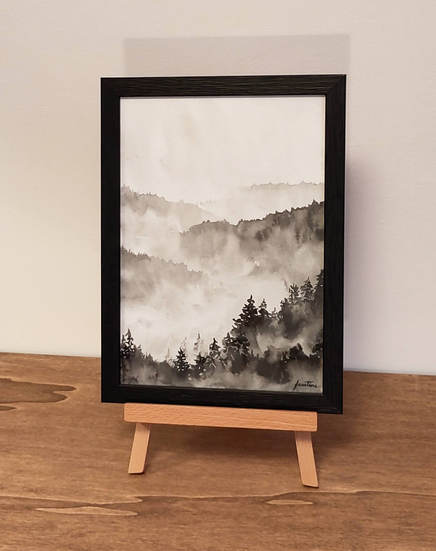 Ce paysage onirique de forêt dans la brume, tout en lavis et fondus, est réalisé à l’encre de Chine. Le paysage étant en noir et blanc, il s’accorde avec tous les intérieurs. Cette forêt brumeuse existe aussi en impressions à la demande plusieurs formats, disponibles ici.