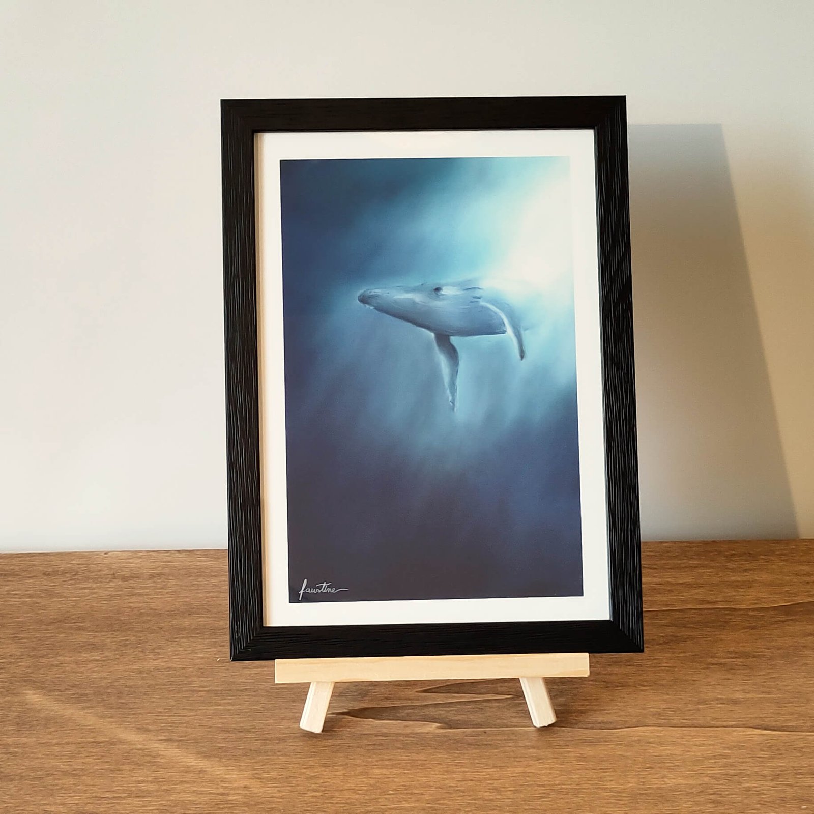 Cette baleine a fait sensation auprès de vous lors des salons et marchés. L’œuvre originale a trouvé sa maison mais il est encore possible de s’offrir une impression en édition limitée. Cette baleine qui fait son apparition dans une mer d’un bleu profond est réalisée au pastel.
