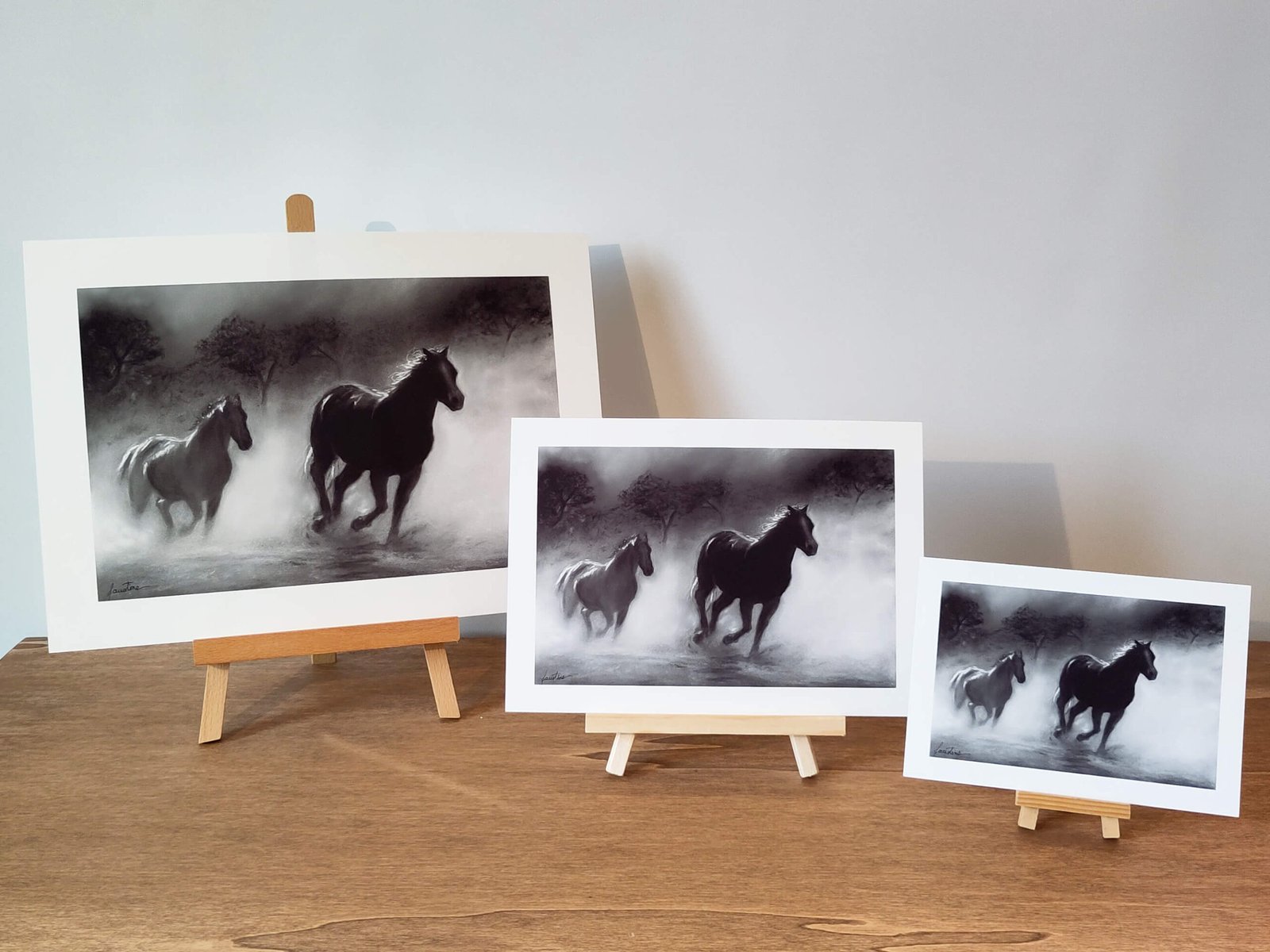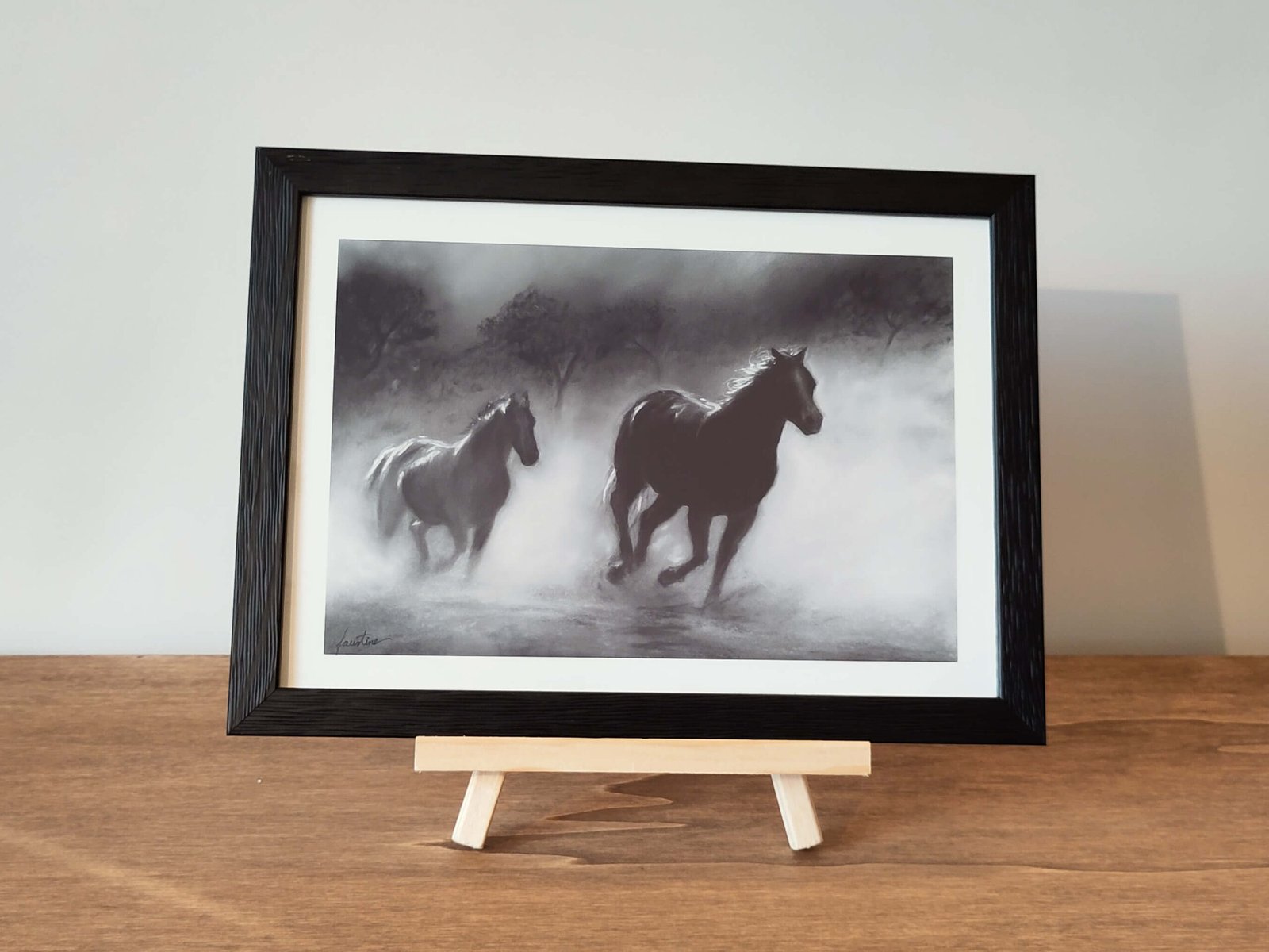 Cette impression du pastel « Galop dans la Brume » en noir et blanc s’adapte à tous les intérieurs ! Le pastel original de ces chevaux lancés au galop est disponible ici.