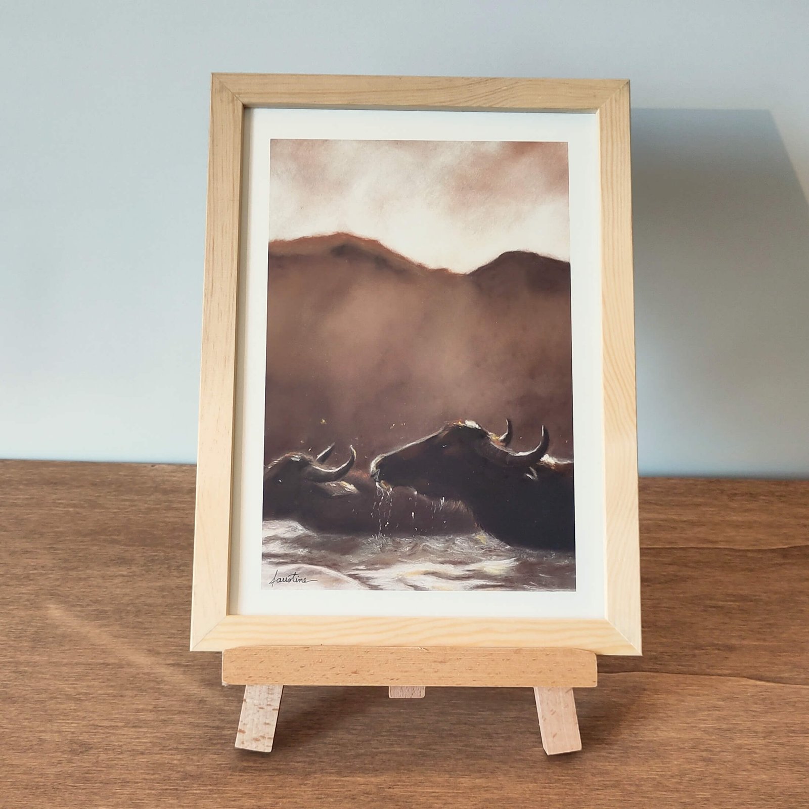 L’impression de ces buffles d’Asie traversant une rivière sur fond de montagne est issue de l’œuvre originale au pastel, disponible ici. Dans des tons monochromes de couleur terre, cette impression s’adapte à toutes les décorations intérieures.
