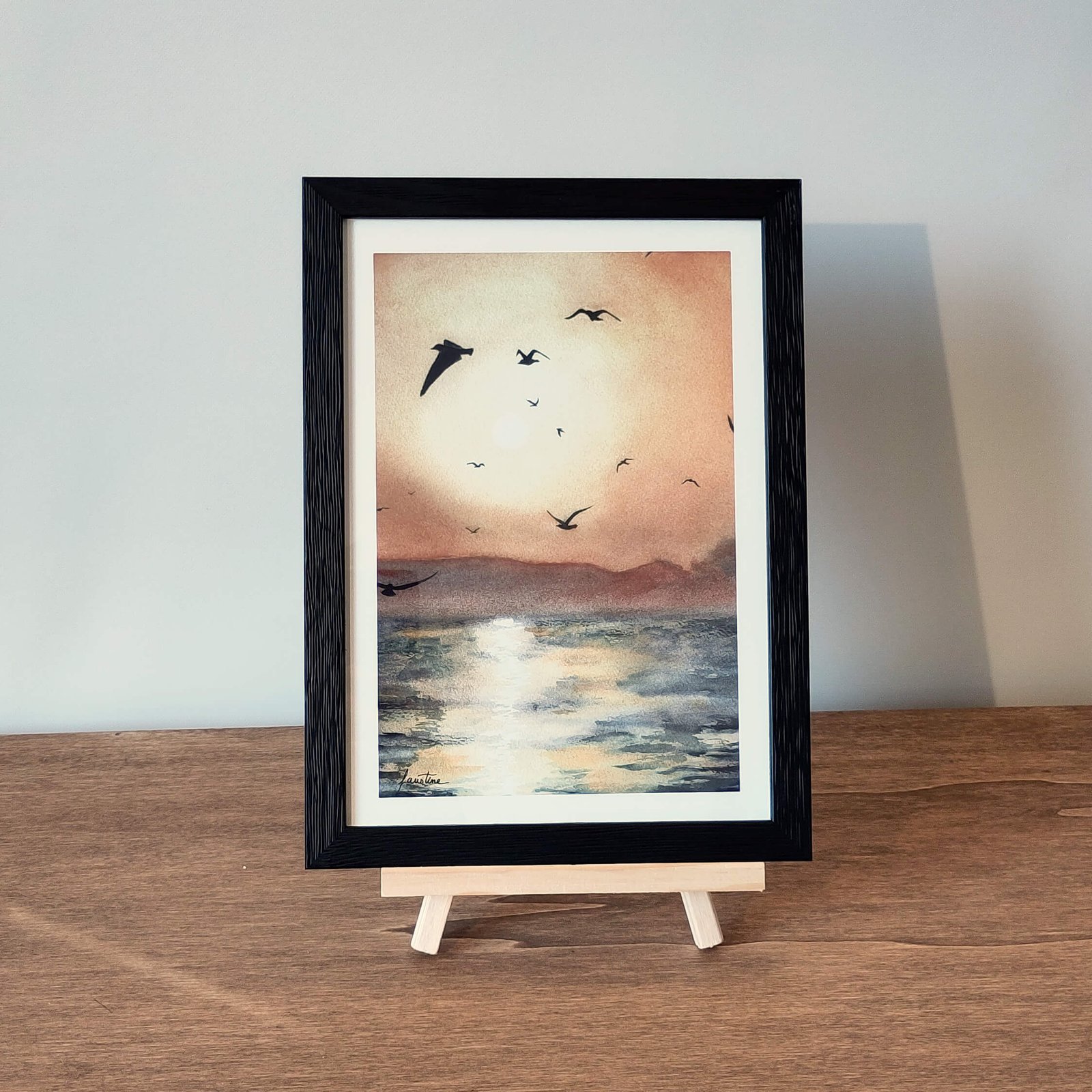 Cette impression d’un vol d’oiseaux dans un ciel lumineux au lever du soleil est issue d’une aquarelle originale disponible ici.