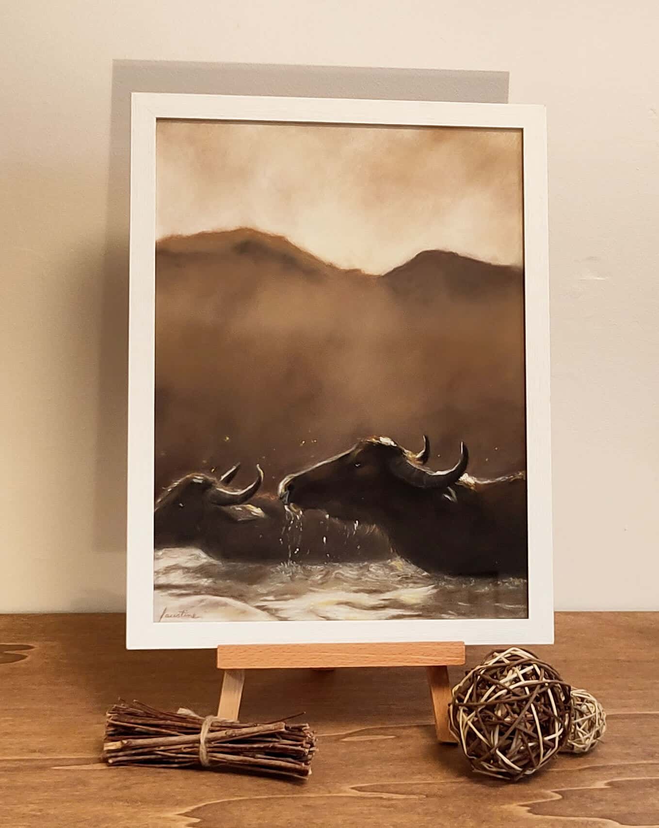 Ces buffles d’Asie traversant une rivière sur fond de montagne sont réalisés au pastel. Dans des tons monochromes de couleur terre, cette œuvre s’adapte à toutes les décorations intérieures.